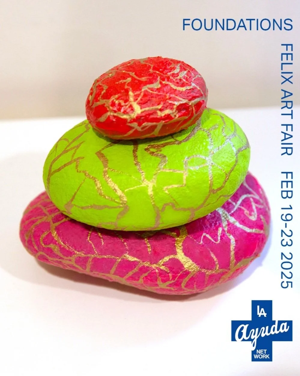 FOUNDATIONS is on display in the ballroom before the Felix Fair entrance. In the wake of the devastating fires in Los Angeles, cornerstones were often all that was left unburned; like these stones, the community has continued to stand and buttress one another. Organized by LA AYUDA, each artist has created unique stones that speak to their creative practice. Together, these hundreds of stones—symbols of the resilience and strength of community—will be sold to raise funds for the most vulnerable communities of Los Angeles County that were impacted disproportionately by the wildfires, as well as structurally excluded from existing recovery aid, such as undocumented, BIPoC, essential workers, children and youth.